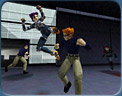 Speaking of the unarmed combat, it's a mix of styles really, be it martial arts or street brawling or wrestling. Basically, anything that looked cool will be included in the game. The controls will be relatively simple, as not to scare away the newer gamers. It will follow the layout of a first-person shooter [keep in mind that Oni is strictly third person], there will be a punch and kick button added. There will be just one button for each instead of two or three. Depending on the direction or how many times you combine the buttons with, you can perform different and spectacular moves. Third person reminds me of Tomb Raider, and that reminds me of its horrible camera system. At least one of the main problems from earlier third-person games will be addressed. Anything obstructing the view of your line of sight will be rendered transparent so you can keep your eye on the action. By building this engine from the ground up, Bungie was able to put in interpolation animation. In a nutshell, it allows you to interrupt your own frames of animation. So instead of waiting for that kick animation to finish before you start shooting, you can interrupt it without delay.